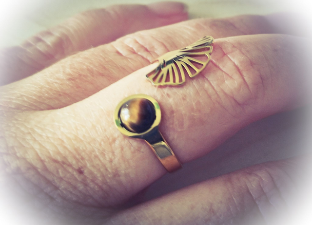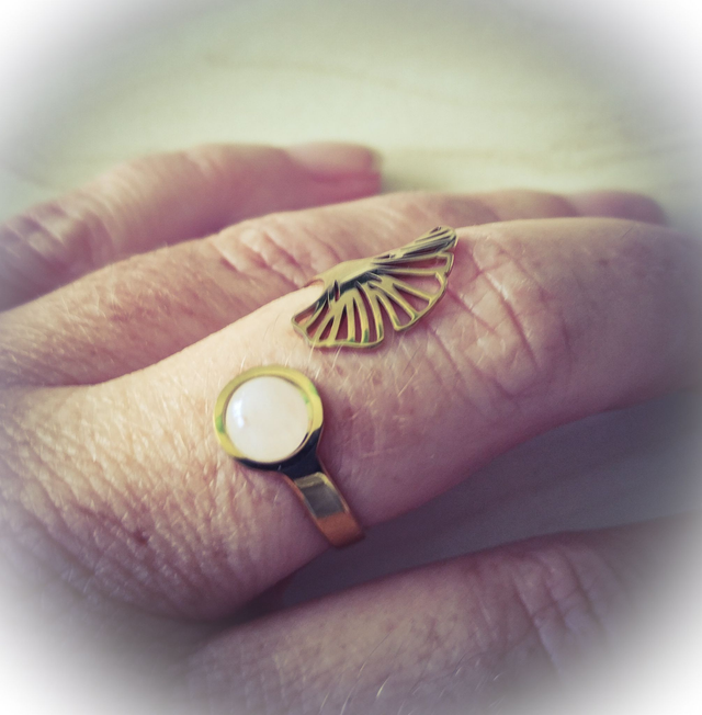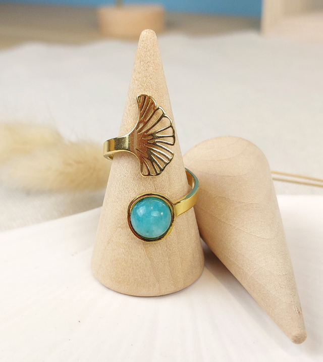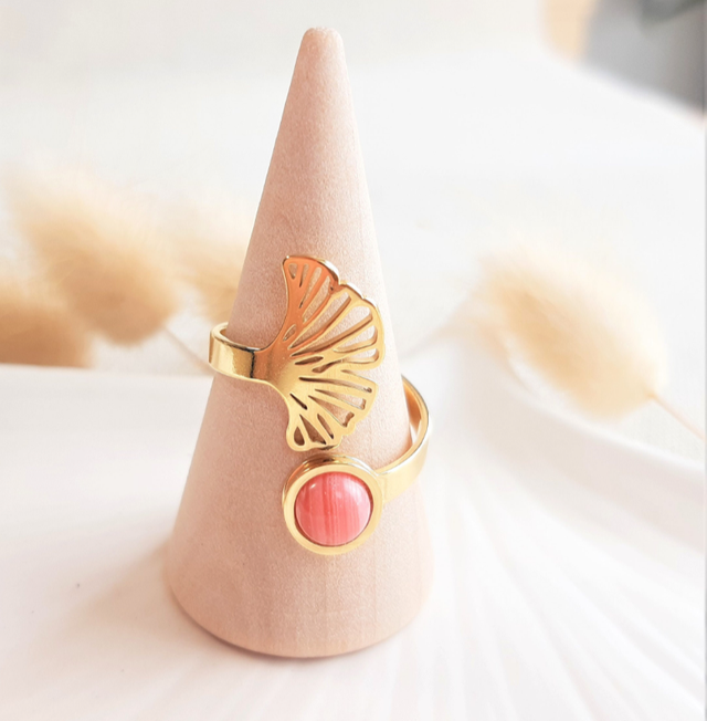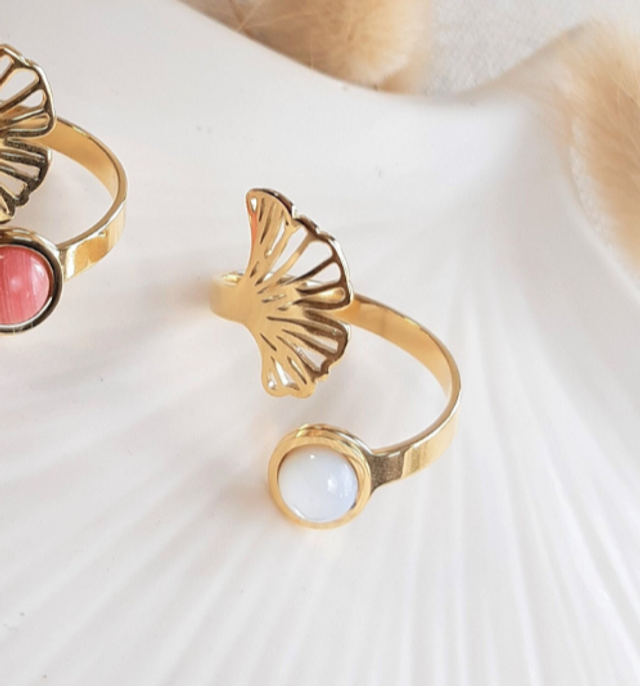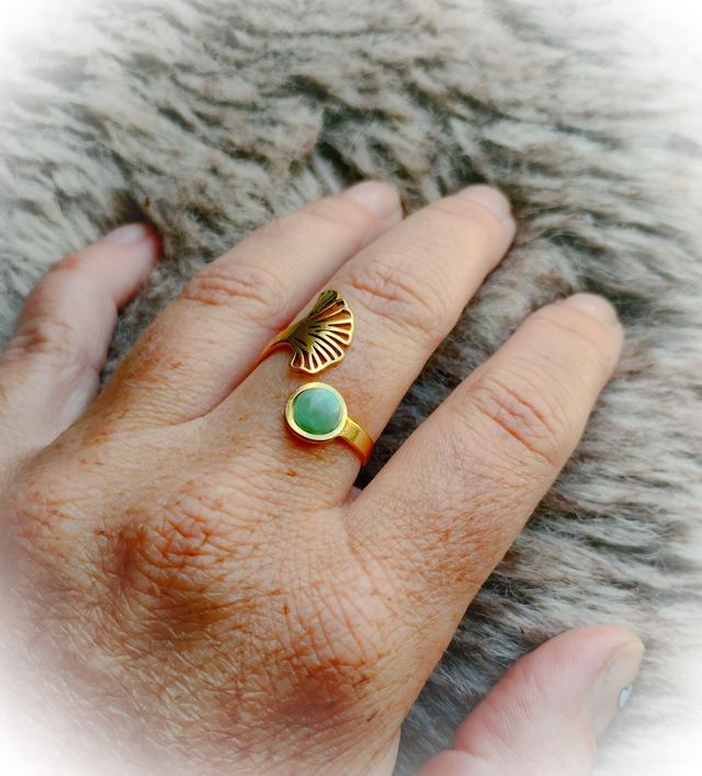 Nouveauté bijou,🌞 Bague ajustable GINKGO acier inoxydable doré, motif feuille de ginkgo ajourée et cabochon pierres naturelles ❤️